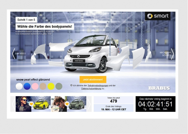Bei fünf Abstimmungen über den für smart relevantesten Social-Media-Kanal Facebook (bitte HIER KLICKEN)und über eine eigens programmierte Microsite (www.smart-fan-edition.com) bestimmen alle Interessierten online über die Konfiguration des Sondermodells: Farbe der bodypanels, Farbe der tridion Sicherheitszelle, Farbe der Sitze und deren Steppung sowie Leichtmetall-Typ der Räder werden per Abstimmung festgelegt.
