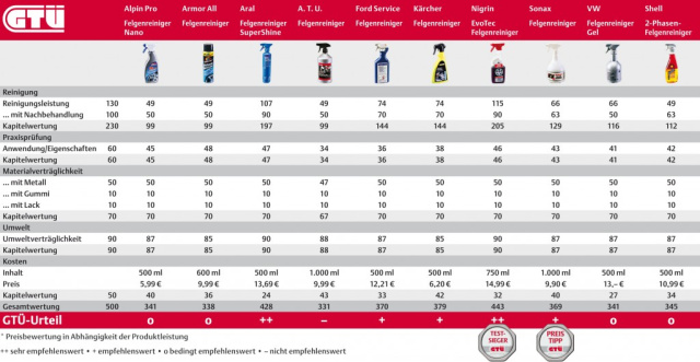 Die Gesellschaft für Technische Überwachung (GTÜ) hat zehn Felgenreiniger der Preisspanne von sechs bis 15 Euro getestet. Neben der Materialverträglichkeit war die Reinigungswirkung wichtigstes Prüfkriterium. Hierbei gab es große Unterschiede.