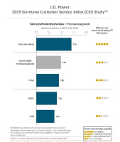 Die in Deutschland durchgeführte CSI Studie 2015 untersucht die Kundenzufriedenheit anhand von fünf verschiedenen Bereichen des Serviceerlebnisses (geordnet nach absteigender Bedeutung): Servicequalität (26%); Serviceanmeldung (23%); Serviceberater (19%); Fahrzeugabholung (18%); und Serviceeinrichtung (14%). Die Zufriedenheit wird dabei auf einer 1.000-Punkteskala gemessen. Mit 770 Indexpunkten ist Mercedes-Benz das Unternehmen mit der höchsten Wertung im Premium-Segment. (Grafik und Quelle: J.D. Power Customer Service Index (CSI) 2015 Studie für Deutschland)