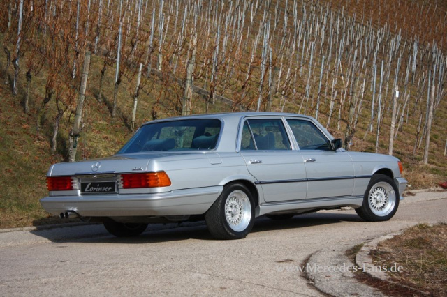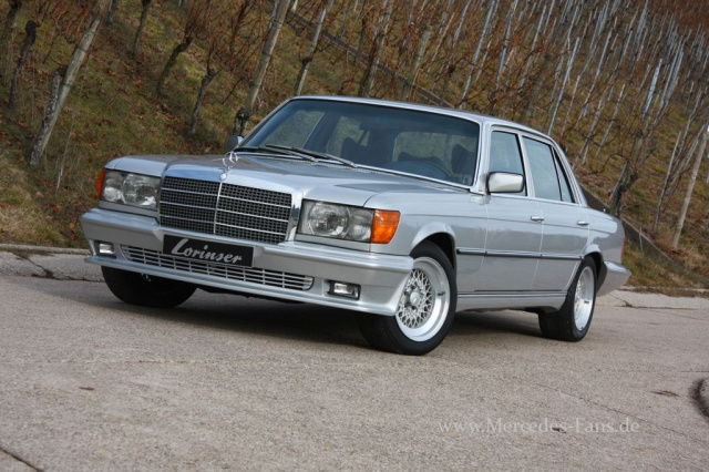 Und damit rückte er auch in das Blickfeld von Lorinser, die sich seit 1976 offiziell mit dem Mercedes-Tuning befassen. Die Anfänge waren bescheiden und reduzierten sich auf ein Optik-Paket. Selbst bei den Rädern bedienten sich die Schwaben mangels eines eigenen Programms bei BBS. Damals sicherlich keine schlechte Alternative! Die schmalen Chromstoßstangen des Originals tauschte Lorinser gegen eine wuchtige, vergitterte Frontschürze mit Nebelleuchten. Seitenschweller bringen eine optische Tieferlegung und am Heck sorgt eine voluminöse Schürze für einen imposanten Abschluss. Für einen markanten Ton sorgte ein Doppelrohrauspuff von Lorinser.