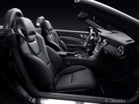 Das Interieur des SLK CarbonLOOK Edition interpretiert moderne Sportlichkeit mit markanten Akzenten. Die zweifarbige Polsterung in Leder Nappa schwarz und designo titangrau pearl mit auffallenden Paspeln in Limettengrün an den Sportsitzen und im Türmittelfeld sorgen für ausgeprägte Dynamik im Innenraum. Dazu tragen auch die carbongeprägten Kopfstützen bei. AMG Zierelemente aus hochwertigem Echt-Carbon und Velourfußmatten mit Einfassungen in Limettengrün und Edition-Logo verstärken das sportliche Erscheinungsbild. Schalt- oder Wählhebel sind mit Leder Nappa bezogen, die Schalthebelmanschette ist ebenfalls in diesem Material ausgeführt. Den sportlichen Charakter des Sondermodells betonen überdies ein Kombiinstrument in Zielflaggenoptik sowie Lenkradschaltpaddles bei Automatikfahrzeugen. Für außergewöhnlichen Komfort sorgen serienmäßig eine Sitzheizung sowie die AIRSCARF Kopfraumheizung für Fahrer und Beifahrer.