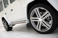 Die Verbreiterungen schaffen Platz für extrem große Räder und Reifen. BRABUS offeriert dem Besitzer der Breitversion, die natürlich auch für alle normalen G-Klasse Modelle mit fünf Türen angeboten wird, eine breite Palette von maßgeschneiderten Rad-/Reifen-Kombinationen von 20 bis 23 Zoll Durchmesser. Als exklusivste Option für den WIDESTAR können auf Vorder- und Hinterachse dreiteilige 11Jx23 Monoblock E PLATINUM EDITION Leichtmetallräder gefahren werden. Die 305/35 R 23 Hochleistungspneus stammen von Pirelli oder YOKOHAMA.
