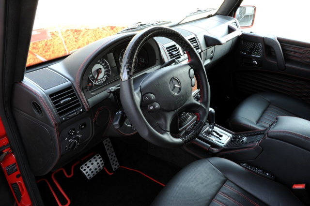 Das Cockpit des BRABUS G V12 S Biturbo WIDESTAR ist individuell und exklusiv gestaltet: Dazu gehören ein ergonomisch geformtes Sportlenkrad, ein Tachometer bis 280 km/h, Edelstahl-Einstiegsleisten mit beleuchtetem BRABUS Logo und eine handgefertigte BRABUS Volllederausstattung in besonders weichem und atmungsfreundlichem BRABUS Mastik-Leder.