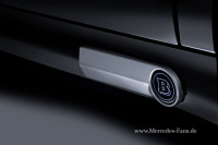 Maßgeschneiderte Aluminium-Sportkotflügel ersetzen die vorderen Serienteile. Ein Luftauslass aus Sicht-Carbon prägt die exklusive Optik genauso wie die Spange mit eingelassenem BRABUS Signet und integrierten LED-Leuchten. Diese werden durch Betätigung der Fernbedienung oder eines Türgriffs aktiviert.