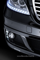 Im Windkanal entwickelten die BRABUS Designer neue Designkomponenten wie die markante Frontschürze, die durch ihre ausgefeilte Formgebung den Auftrieb an der Vorderachse reduziert. Der große zentrale Lufteinlass optimiert zusätzlich die Kühlung von Motor und vorderen Bremsen. Integrierte Zusatzscheinwerfer und