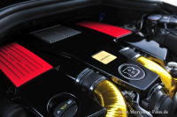 Herzstück des BRABUS B63S - 700 Motorumbaus ist die neu konstruierte Peripherie des aufgeladenen Achtzylinder-Vierventilers. Während die Ansaug- und Ladeluftrohre mit BRABUS Gold Heat Reflection sofort die Aufmerksamkeit des Betrachters wecken, bleiben die anderen wichtigen Details des Umbaus von außen unsichtbar. Dazu gehören die beiden BRABUS Spezial-Turbolader mit größerer Verdichtereinheit, die mehr Ladedruck als die Serienturbos aufbauen.