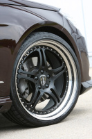 So spendierte die Spezialisten aus der Nähe des Bodensees dem W212 einen Carbon-Frontspoiler für ein Plus an Downforce auf der Vorderachse, einen Satz Seitenschweller mit integrierten Carbon-Tubes zur besseren Kanalisierung der Fahrtluft an den Flanken und einen Heckspoiler, den es wahlweise in Carbon oder in Wagenfarbe gibt. Die Carbon-Spiegelschalen dagegen gehören mittlerweile wohl zu jedem guten Mercedes-Umbau. Für ebenfalls ein Plus an Downforce, diesmal aber an der Hinterachse, sorgt ein Carbon-Heckdiffusor mit integrierten Auspuffblenden.