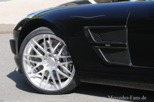 Einen elementaren Beitrag zur aufregenden BRABUS Optik leisten auch die speziell für den SLS entwickelten Schmiederäder. Durch die Wahl einer Rad/Reifen-Mischkombination in 20 und 21 Zoll Durchmesser an Vorder- und Hinterachse wird die sportliche Optik des Zweitürers noch stärker betont. Die ultraleichten BRABUS Monoblock F PLATINUM EDITION Kreuzspeichenräder sind bis zu zwölf Prozent leichter als der Serienräder des SLS und werden in den Dimensionen 9.5Jx20 vorne und 11Jx21 an der Hinterachse gefahren. Die extrem breiten Hochleistungspneus der Größen 275/30 ZR 20 und 295/25 ZR 21 kommen von den Technologiepartnern Pirelli und YOKOHAMA.
