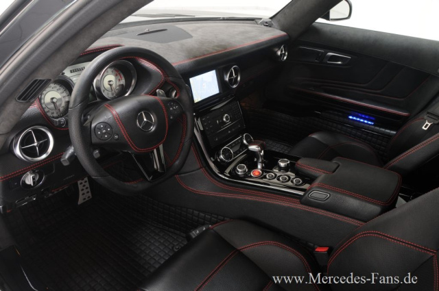 Für das Cockpit des Zweisitzers entwickelten die BRABUS Interieurdesigner exklusive Accessoires und meisterhaft verarbeitete Individualausstattungen. Der Tachometer mit 400 km/h Skala gibt schon jetzt einen Ausblick auf die zukünftige Performance mit BRABUS Motortuning. Ein ergonomisch geformtes Sportlenkrad gehört genauso zum Programm wie Edelstahl-Einstiegsleisten mit beleuchtetem BRABUS Logo oder matt eloxierte Pedale. In der BRABUS Sattlerei entstehen auch für den SLS Innenausstattungen, die in Leder-, Alcantara- und Farbwahl genauso exakt auf die Wünsche des Autobesitzers abgestimmt werden können wie in Design und Polsterung. Individuelle Wünsche können auch bei den Einlagen für Armaturenbrett, Mittelkonsole und Türverkleidungen erfüllt werden. Carbon- und Edelholzausstattungen fertigt BRABUS in jedem gewünschten Farbton und jeder Oberflächenbeschaffenheit an.