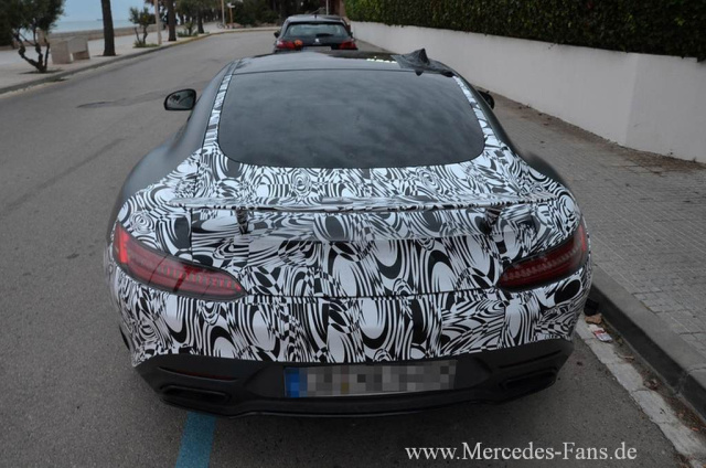 Der fotografierte Mercedes-AMG GT Edition 1 ist nur an den Stellen getarnt, wo sich die Edition 1 vom normalen AMG GT unterscheidet. Besonderes Merkmal ist der fest stehende Heckspoiler.