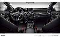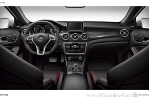 Im Interieur des GLA 45 AMG Edition 1 dominieren die Farben Schwarz und Rot. Die AMG Performance Sitze in Ledernachbildung ARTICO/Mikrofaser DINAMICA zieren ebenso rote Kontrastziernähte wie die Türmittelfelder, das Oberteil der Instrumententafel in Ledernachbildung ARTICO und das AMG Performance Lenkrad in Leder Nappa/Mikrofaser DINAMICA. Weitere optische Glanzpunkte sind der E-SELECT Wählhebel mit geprägtem AMG Wappen sowie die Edition 1-Plakette auf der AMG DRIVE UNIT. Passend zu den AMG Sport-Streifen auf der Fahrzeugflanke präsentiert sich das exklusive Zierelement an der Instrumententafel. Die hochwertige Oberfläche überzeugt optisch wie haptisch: Glänzende und matte Elemente erzeugen ein spannendes Wechselspiel mit der Rautengrafik und dem rechts platzierten AMG Schriftzug.