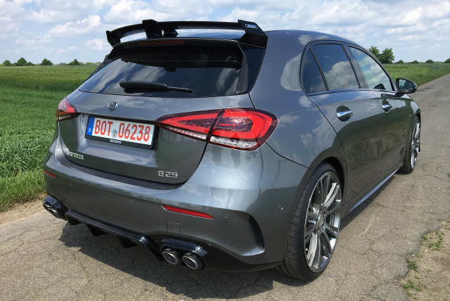 Nach den ersten Kilometern im B25 S wird die Idee des Fahrzeugs schnell deutlich. Im Sport-Modus macht die Klappen-Sportauspuffanlage angemessen fröhlich Radau. Im Gegensatz zum Serien-250er klingt der BRABUS gemein und knackig. Die 46 Mehr-PS im B25 S sind so veranlagt, dass sie genau da einsetzen, wo dem A250 die Puste ausgeht. Perfekt! Fahrspaß pur! Die Leistung ist optimal abgestimmt. Wir haben nicht das Gefühl, in einem geschärften A250 zu sitzen, nein – dies ist schon eine komplette Stufe oben drüber. Klang, Leistung und Optik sind mit einem A250 nicht zu vergleichen. Dank der zusätzlichen Leistung wirkt das Fahrgefühl viel souveräner und somit deutlich "mercedesiger" komfortabler. Das Fahrwerk ist übrigens unangetastet geblieben. Das Serienfahrwerk steckt die Mehrleistung locker weg und kommt auch mit den 20-Zoll-Felgen gut zurecht, die ja nur eine 30er Gummierung tragen. Auch auf kibbeligen Landstraßem ist das Fahrgefühl klar definiert und es macht eine Menge Spaß die Mehr-Leistung abzurufen. Das haben die Jungs und Mädels bei BRABUS schon ziemlich gut hinbekommen.