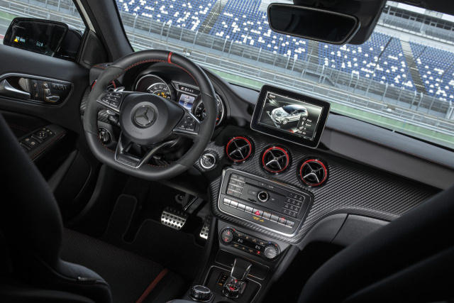 Doch damit nicht genug, kürzer gewählte Übersetzungen der Fahrstufen drei bis sieben des AMG SPEEDSHIFT DCT 7-Gang Sportgetriebes vermitteln über einen breiten Geschwindigkeitsbereich nicht nur gefühlt mehr Agilität, sondern die Summe der Maßnahmen schlägt sich selbstverständlich auch objektiv messbar in den Fahrleistungen nieder. Der Sprint auf die 100 km/h-Marke ist bereits nach 4,2 Sekunden erledigt. Damit beschleunigt der neue A 45 beeindruckende 0,4 Sekunden schneller als das Vormodell. In diesem Bereich ist eine knappe halbe Sekunde eine Ewigkeit. Oder besser gesagt, eine Meisterleistung. Die Höchstgeschwindigkeit liegt wie beim Vorgänger bei elektronisch gebremsten 250 km/h, in Verbindung mit dem AMG Driver’s Package lässt sich die Topspeed auch auf 270 km/h anheben.