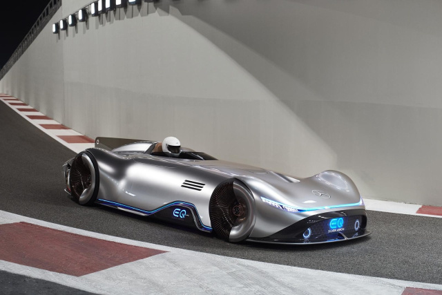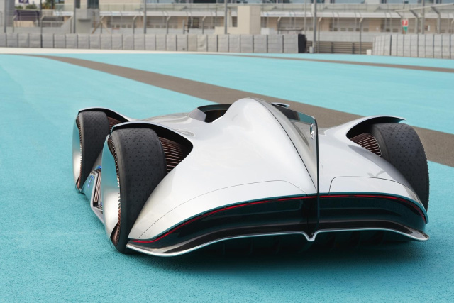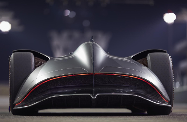 Genug Einsamkeit, um auf dem Formel-1-Kurs ungestört mit dem Vision EQ Silver Arrow zu rollen. Das Mercedes-Showcar wurde im Sommer im kalifornischen Pebble Beach präsentiert. Der im Scheinwerferlicht schimmernde, flache Einsitzer soll an den erfolgreichen Rekordrennwagen W 125 von 1937 erinnern. Damals entstand der Mythos der Silberpfeile, weil die Mechaniker den weißen Lack bis aufs silberne Blech abgeschabt hatten, um Gewicht zu sparen. Der EQ Silver Arrow dagegen bekam extra eine Mehrschichtlackierung in Alubeam-Silber, um so zu glänzen wie sein historisches Vorbild - Gewicht spielt bei einem Showcar nur eine untergeordnete Rolle. Außer der Farbe ist auch das geschwungene und stromlinienförmige Design am W 125 orientiert: flach, mit weit ausladenden Radhäusern, mittigem Fahrersitz, offenem Dach und einer Heckfinne aus Plexiglas mit einem ausgesägten Mercedesstern am Ende. Bei 5,30 Meter Länge ist der EQ Silver Arrow mit seiner Karosserie aus Kohlefaser gerade mal einen Meter hoch. „Schlank, aber sinnlich“, schwärmt Daimlers Chefdesigner Gorden Wagener.