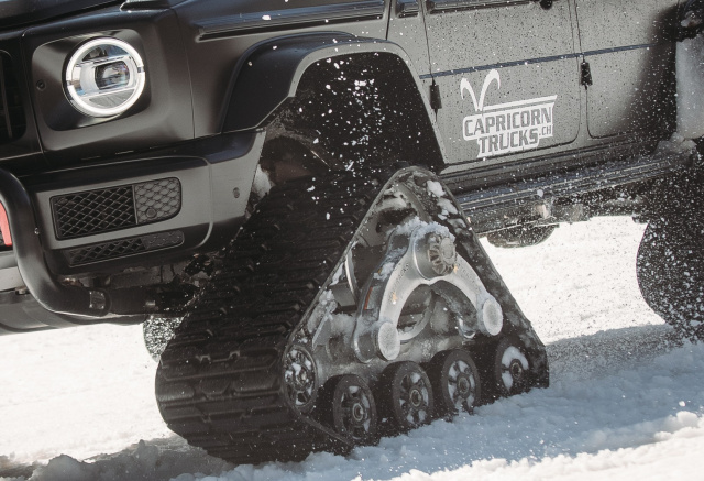 Um für die gewaltigen Raupen unter den Kotflügeln die nötige Bewegungsfreiheit zu erhalten wurde die G-Klasse um 20 Zentimeter höher gelegt. delta4x4 gestaltete die Anbindung der Raupen am G500 derart, dass sie des Sommers abmontiert werden können. Dann kann wieder auf Reifen gefahren werden.