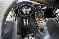 Im Interieur des SLS AMG GT3 45th ANNIVERSARY dominiert die funktionelle Rennwagen-Atmosphäre, die mit hochwertigen, exklusiven Details veredelt wird: Der Stahl-Überrollkäfig ist passend zum Exterieur ebenfalls im Mattlack designo magno graphit gehalten. Instrumententafel und Mittelkonsole des Rennwagens wurden in Carbon matt gestaltet. Effektvolle Kontraste bilden Sechspunkt-Sicherheitsgurte und Rennlenkradstern in Silber. Das Sammlerstück verfügt auch auf der Beifahrerseite über eine Sitzschale in einer hochfesten Carbon-Sicherheitszelle. Eine spezielle Plakette mit einem 1 of 5-Logo auf den Sitzen und auf der Mittelkonsole weist auf die limitierte Stückzahl des Rennwagens hin. Abgerundet wird die serienmäßige Ausstattung des SLS AMG GT3 45th ANNIVERSARY durch ein hochwertiges AMG Indoor Car Cover mit 45 Years of Driving Performance-Logo.