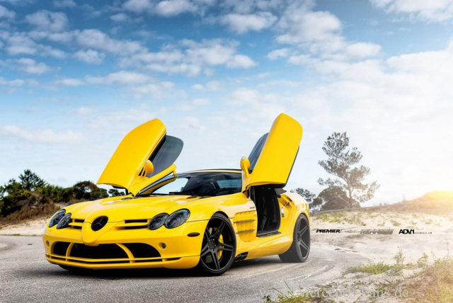 Großartiger als mit einem Mercedes-Benz SLR McLaren (Baureihe 199) kann man mit einem Flügeltürer nicht die Flatter machen. 626 PS und beachtliche Optik waren bei dem Roadster, der von 2004 - 2009 gebaut wurde, schon inklusive. Und doch kann man den atemberaubend sportlichen Roadster noch großartiger ins Rollen bringen - wie die Bilder eines von Premier Exotics und US-Tuning-Schmiede Renntech forcierten Exemplars beweisen. Die Karosserie präsentiert sich knallig-gelb mit schwarzen Applikationen - was für einen hochspannenden Anblick sorgt.