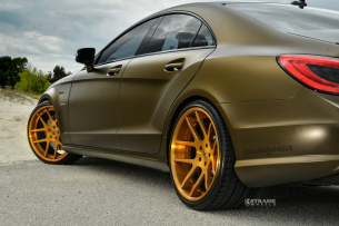 Wie schafft man es nur, dass ein Mercedes CLS 63 noch stärker als ohnehin dasteht? Bei DV8 Motorsports wählte man folgenden Weg, um die Driving-Performance-Qualitäten des viertürigen Oberklasse-Coupés zu betonen: Zunächst einmal packte man die Karossserie eine Folie mit einem glänzenden Goldbronzeton. Ein identisches Finish macht auch die SM5-Räder von Strasse in 9 x 20 VA und 11 x 20 HA noch ansehnlicher. Ein markantes Design-Kit, bestehend aus Frontsplitter, Heckdiffusor und -spoiler betont die Dynamik des sportlichen Coupés, das sich von einem KW-Gewindefahrwerk in die Tiefe zwingen lässt und dank Motortuning rund 690 PS unter der Haube hat. (Bilder: Strasse Wheels)