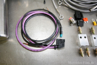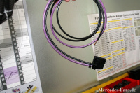 Nun wird der mitgelieferte Kabelsatz benötigt. Das lilafarbene Kabel (CAN-Bus-Leitung) wird zu einem Steuergerät im Fahrzeug geführt, welches ein Geschwindigkeitssignal liefert, um den Wagen beim Erreichen eines vorprogrammierten Tempos wieder abzusenken. Am schwarzen Kabel wird der Schalter im Innenraum angeschlossen. Der Kompaktstecker wird mit dem Steuergerät der HLS-Einheit verbunden.