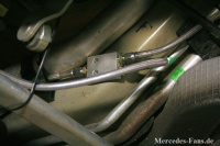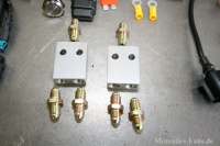 Nun werden die beiden Leitungen je Achse (je eine für rechts und links) nun an einer geeigneten Stelle am Fahrzeugboden zusammengeführt und an einem Verteilerblock verschraubt. Von da aus werden die Leitungen für Vorder- und Hinterachse zur Einbauposition der Hydraulik-Einheit geführt. Dabei sollte versucht werden, möglichst keine zusätzlichen Löcher in die Karosserie zu bringen und vorhandene Öffnungen zu nutzen.