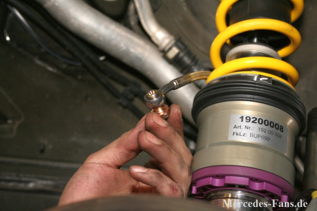 Sind alle Federbeine an ihrem Platz geht es mit der eigentlichen Montage des HLS-Systems los. Hierfür werden an jedem Federbein die Hydraulikleitungen mittels Hohlschrauben und zwei Dichtringen geschraubt.