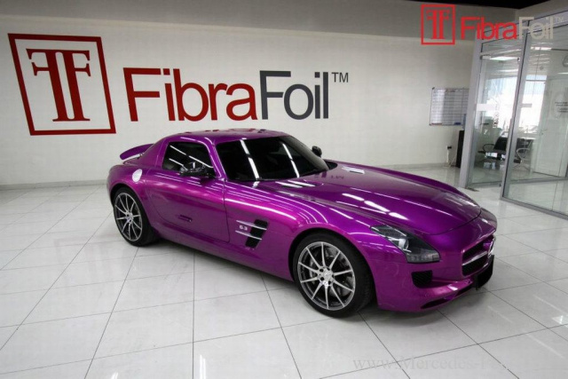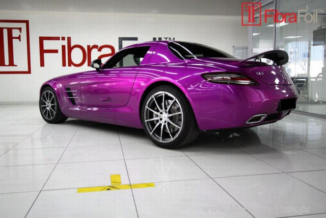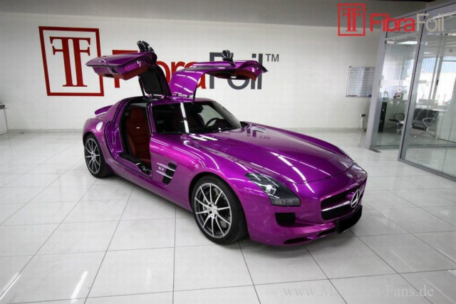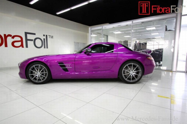 Die schwarz getönte Scheiben sehen am SLS AMG ja gut aus. Doch wie steht es mit der lilafarbenen Folie für die Karosserie?
