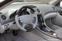 Der Innenraum präsentiert sich in in einer Komposition aus grauem und weißem Leder, wobei das Schnittmuster in Rautensteppung gehalten ist. Der Dachhimmel wurde ebenfalls komplett beledert. Ein ergonomisches Sportlenkrad, ein 300 km/h-Tacho mit speziellen Tachonadeln (auf 6 Uhr geeicht) und viel edles Holz aus Vogelaugen-Ahorn runden das Innenraumprogramm dieses SL ab.