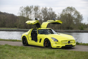 vier Elektromotoren über eine Gesamtleistung von 552 kW (751 PS) verfügte. Der voll elektrische SLS war damals nicht nur das stärkste AMG High-Performance-Fahrzeug aller Zeiten, mit einer Beschleunigung von 0-100 km/h in 3,9 Sekunden avancierte der Flügeltürer auch zum schnellsten elektrisch angetriebenen Serien-Fahrzeug der Welt. Und noch ein Superlativ: Mit einem Verkaufspreis von 416.500 € war er rund doppelt so teuer wie die Verbrenner-Version. Immerhin scheint das Geld in einen SLS AMG Electric Drive gut angelegt gewesen zu sein, denn an einem gebrauchten Exemplar wie das, welches im Private Sale von RM Sotheby's aktuell angeboten wird, hängt heute ein Preisschild von 1.050.000 Euro.