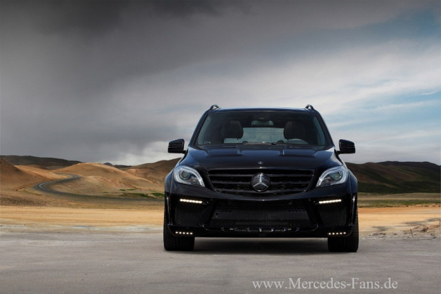 Dicke Radhausverbreiterungen und sportive Seitenschwellerleisten gehören zum Breitbau-Kit dazu. Sie bilden einen fetten Speckgürtel, der um das Mercedes SUV gespannt ist.