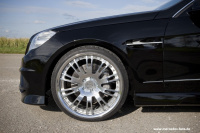 Für die ultrabreite Spur wurden spezielle, besonders leichte und topaktuelle Räder montiert. Die Lumma-Leichtmetallfelgen Racing Edition mit 9x20 und 10,5x20 Zoll wurden mit 245/30 R20 und 285/25 R20 Hochleistungspneus von Michelin bestückt. Dank einer Tieferlegung duckt sich die E-Klasse 25 mm tiefer auf der Straße.