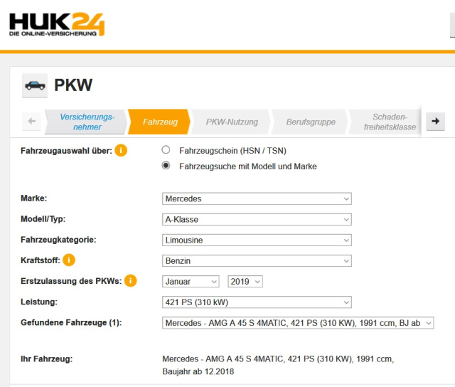 Wir warten auf den A45 AMG. Es lohnt sich. Wer hoch dynamisch und agil mit einem kompakten Stern aufkreuzen will, sollte sich vielleicht das bereits erhältliche Einstiegsmodell Mercedes-AMG A 35 mit 306 PS sparen und noch etwas bis zum Frühjahr bis zur Premiere des A45 gedulden. Den neuen 2-Liter-Turbo-Motor im A45 wird es nämlich mit zwei Leistungstufen geben. Mit wie viel Kraft sich der A45 der Baureihe W177 fortbewegen wird, hat Mercedes-Benz zwar noch nicht offiziell bekannt gemacht - der Kfz-Versicherer HUK24 dagegen schon. Auf dessen Online-Seiten für ein Versicherungsangebot ist der A45 mit 387 PS (6 PS mehr als der Vorgänger) und der A45 S mit einer Leistung von 421 Pferdestärken angegeben. (Screenshots: HUK24)