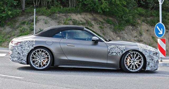 Auf den aktuellen Bildern ist der neue SL lediglich noch an der Front, am Heck und an den Kiemen leicht maskiert. Dennoch lässt sich auf den Fotos erstmals der Diffusor am Heck gut erkennen. Zwar zeigt er sich noch nicht final, aber die Kontraste und Formen lassen erahnen, wie das Bauteil für Aerodynamik und Sogwirkung beim neuen SL ausschauen wird.