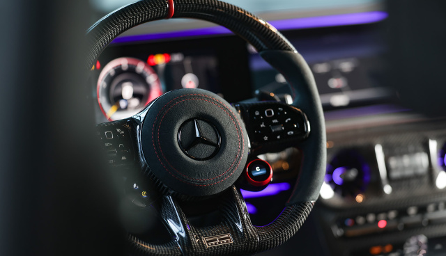 Werfen wir einen Blick auf die neueste Kreation der Waltroper: In Handarbeit ist das neue SCHAWE Carbon Interieur für den G63 entstanden. Hier sorgt nun ein beheizbares SCHAWE Carbon Lenkrad (Code LH1) mit AMG Tasten (Code U88) für den richtigen Griff. Verfeinert wurde das Lenkrad mit SCHAWE Carbon Schaltwippen und einer roten 12 Uhr-Markierung in Nappaleder. Des weiteren begrüßen die Passagiere beim Einsteigen und öffnen der Heckklappe SCHAWE Carbon Einstiegsleisten. Diese wurden von Daniel Wesner und seinem Team vorne, hinten sowie an der Heckklappe montiert. Für edlen Look sorgen auch die SCHAWE Carbon Abdeckungen der Sitzverkleidungen.