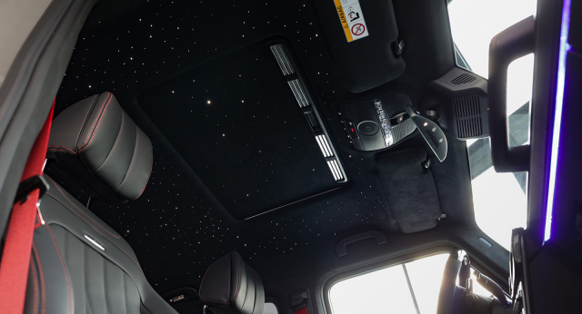 Hochwertig wurde auch das SCHAWE Black Interieur Paket verbaut. Dies umfasst eine schwarze Lackierung von Chrom-Bauteilen wie Bedienelementen, Schaltern, Tasten und Lautsprechergittern. Ein in Alcantara gefasster SCHAWE Sternenhimmel ergänzt das ganzheitliche Ambiente des Interieurs.