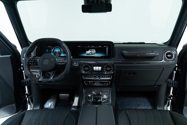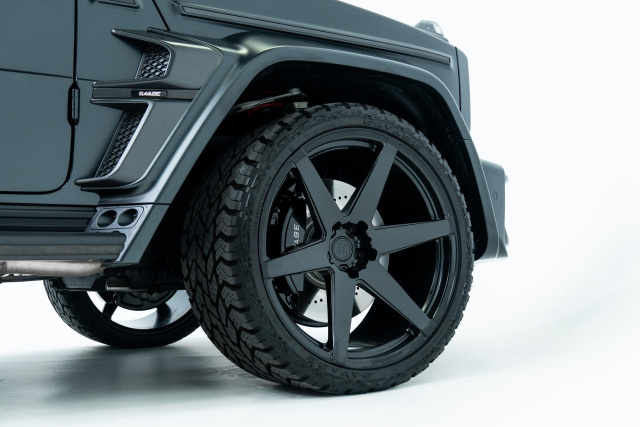 Kräftiger gestaltet wurde auch die Leistung des G63. Der ab Werk 585 PS leistende V8 wurde auf 700 Pferdestärken gepusht. Auf 12,5 x 23-Zoll Savage-Felgen, die mit 375/25er Pneus Gummi geben, rollt die um 40 mm gesenkte Karosse an.