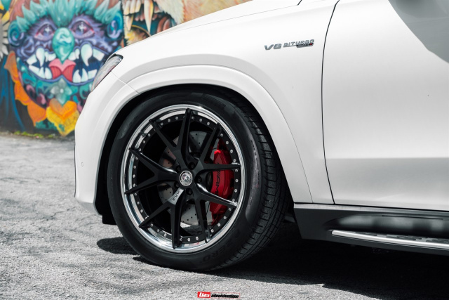 Für eine Position auf der Piste mit mehr Power-Aussage wurde der GLE 63 S mit HRE S101-Felgen im Format 10,5 x 22 und 12 x 22 bestückt. Die Felgen mit dem in Satin-Schwarz gehaltenem Center profilieren sich mit Pirelli-P-Zero-Reifen in 285/40 und 325/35. Dank Neujustierung des Fahrwerks steht die Rad-/Reifenkombination 1a in den Gehäusen.