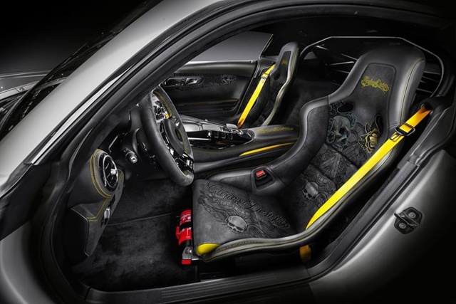 Das AMG-GT-Unikat ist das Werk des polnischen Veredlers Carlex. Die Tattoos auf dem Exterieur zeigen schaurige Skull-Motive. Die Schädel mussten ihren Kopf auch für die neuen samtigen Sitzbezüge herhalten, wo sie mit vielen Ornamenten eine an Symbolen reiche Zeichensprache bilden. Schön ist der Kontrast der schwarzen Leder-/Alcantarastoffe mit dem Gelb von Ziernähten und Sitzgurten gelungen. Das glatte und glänzende Nappaleder oben auf dem Armaturenbrett sieht allerdings etwas gewöhnungsbdürftig aus, dürfte von Staub und Schmutz allerdings leichter als ein Veloursstoff zu reinigen sein. (Bilder: Carlex)
