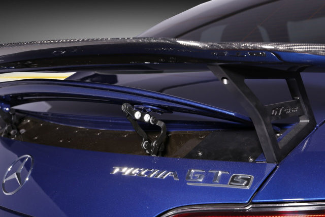 Der PIECHA AMG GT-RSR trumpft erstmalig mit einem statischen GT-Heckflügel und einen zusätzlich ausfahrbaren Brems-Heckspoiler auf. Er rollt an der Vorderachse mit 275/35 ZR19 YOKOHAMA Advan Sport V105 und an der Hinterachse mit 305/30 ZR 20 YOKOHAMA Advan Sport V105 Reifen an. Zusätzlich wurden an beiden Achsen 13-mm-Spurverbreiterungen verbaut.