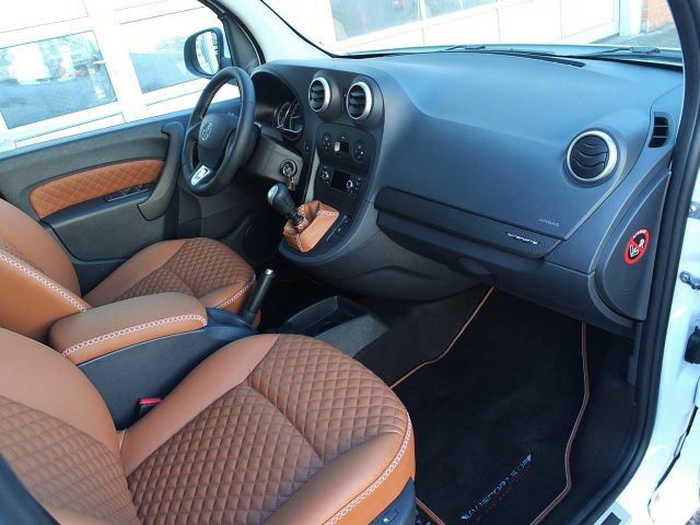 Dank der CP Line von VANSPORTS by HARTMANN Tuning gibt es des Weiteren viele Möglichkeiten auch die inneren Werte des Mercedes Citan zu verbessern. Edel aufmöbeln lässt sich das Citan-Interieur zum Beispiel mit cognacfarbenem Büffelleder für Schaltsack, Türverkleidung sowie Front- und Fondssitze. Sportliche Highlights in der herrlichen Lederlandschaft setzen Kontrastnähte und Rautensteppung. Darf es noch etwas mehr für den Mercedes-Benz Citan sein? Kein Problem für HARTMANN Tuning! Zur CP Line gehören noch Alu-Pedalauflagen, Alu-Einstiegsleisten, ein HARTMANN-Tuning-Fußmatten-Set mit Ledereinfassung im Stil der Sitzbezüge sowie ein Dekor in Matt-Carbon für Zierleisten und Armaturenbrettpaneel.