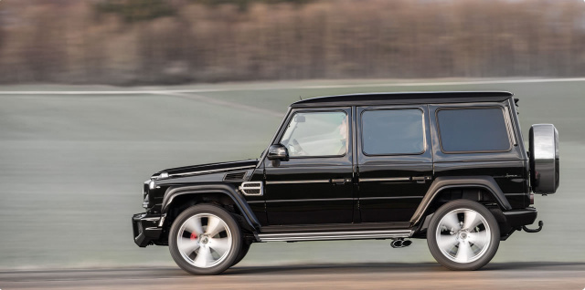Die Front wirkt gestreckt, durch den nun einteiligen Frontgrill. Aus dunklen LED-Lichtbalken leuchtet das Tagfahrlicht. Große Öffnungen in der neugeformten, nach oben gebogenen Stoßstange versorgen auch die großen Kühler der AMG-Versionen. Silberne Lufteinlassgitter zieren die vorderen Kotflügeln. Die höheren Verbreiterungen haben einen tiefer abgesetzten Rand – in zweifarbiger Lackierung setzen sich diese elegant von der Karosserie ab. Das Front-Dachschild mit integrierten LED-Lights zitiert den G 6x6, kann aber auch Basis für zusätzliche LED-Fernlicht-Balken oder LED-Arbeitsscheinwerfer sein. Die Sidepipes enden in Doppel-Oval-Endrohren.