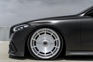 Die 22-Zoll-Schmiederäder haben die Modellnummer D100 und harmonisieren mit ihrem glänzenden Look ausgezeichnet mit dem mattschwarzen Exterieur der S-Klasse. Die