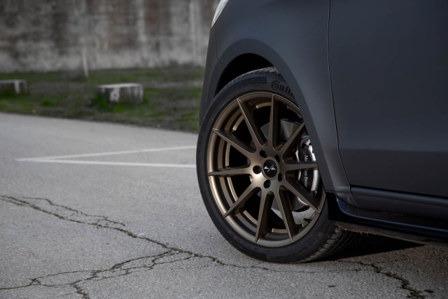 Zum absoluten Eyecatcher aber macht den V 300 d zweifellos seine – von VANSPORTS bewusst polarisierend gewählte – Vollfolierung in matt-dunkelgrauer Folie von 3M. Diese greift den derzeitigen Trend zu matten Oberflächen auf und setzt nicht nur die (mit Ausnahme des Dachkantenspoilers) schwarz glänzenden VP Spirit-Karosserieanbauteile perfekt in Szene, sondern darüber hinaus auch die in warmem Bronze matt lackierten, hauseigenen ORSA-Leichtmetallfelgen. Letztere messen rundum 8,5x20 Zoll ET45 und verleihen dem V 300 d im Zusammespiel mit dem VANSPORTS.DE-Sportfedersatz sowohl eine dynamische Optik, als auch eine satte,sportlich-komfortable Straßenlage.