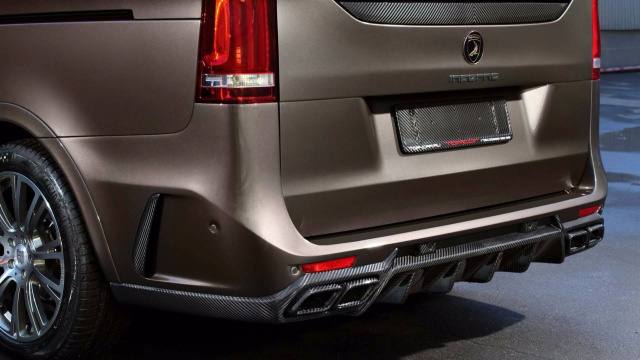 Bei Front- und Heckstoßfänger handelt es sich um völlig neu gestylte, eigenständige Parts. Das betont den individuellen Auftritt der V-Klasse. Der große Heckdiffusor sowie die Carbon-Auspuffenden unterstreichen besonders den dynamischen Eindruck. Zum Body-Kit gehören ferner einen Heckklappen-Carbon-Spoiler, Carbon-Seitenschwellerleisten sowie vergrößerte Kotflügel. Darüber hinaus ist eine Vollcarbon-Motorhaube für die V-Klasse lieferbar.