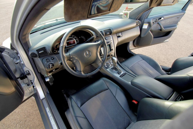 Angesichts des stark auf Racing-Flair getrimmten Exterieurs überrascht dann ein Blick ins Innere. Nicht Rennsportschalen oder Käfig bestimmen hier das Bild, sondern ein eher verfeinertes Original-Interieur mit einer voluminösen Audio-Video-Anlage plus Playstation 2! So finden sich in den vorderen Kopfstützen ebenso TFT-Bildschirme wie in den vorderen Sonnenblenden. Gleich vier Player könnten also das DTM Race Driver 3 zocken, ohne dass der Mercedes auch nur einen Meter rollt.