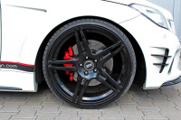 In den massiv verbreiterten Radkästen drehen sich PD1-Leichtmetallräder - vorne im Format 9 x 20 Zoll mit 235/30R20 und hinten in 10,5 x 20 Zoll mit 285/25R20 Falken FK452-Bereifung. Die Tieferlegung des Chassis übernehmen H&R-Sportfedern. Hinter den Felgen lugen rot lackierte Bremssättel hervor.