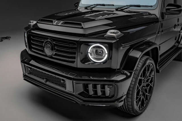 Noch einen Schritt weiter geht das Urban Widetrack Styling-Programm, das auf dem Aero-Kit aufbaut, aber die Spurweite deutlich verbreitert. Das Resultat ist ein extrem breiter G-Wagon mit komplett neuen Front- und Heckstoßstangen, einer geschlossenen Bullnose-Motorhaube mit Nasenlöchern in Sichtcarbon, Schwellerverkleidungen, großen Radkästen und vielen weiteren carbonfaserveredelten Komponenten.