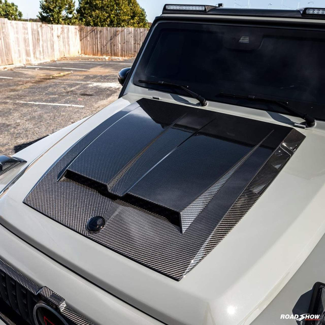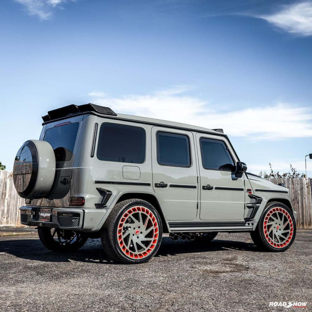 In Deutschland entwickelt und in den USA verbaut: Der deutsche Tuner BRABUS ist der Urheber des G800 Widestar-Kits für den Mercedes-AMG G63. Er entwickelte ein Power-Upgrade für den 4-Liter-Biturbo-V8 und ein markantes Design-Kit drumherum. Bei Road Show in den USA nahm man das gewaltige Tuningpaket von BRABUS und transformierte einen Mercedes G63, der in ein sehenswertes Nardo-Grey koloriert ist, entsprechend um.