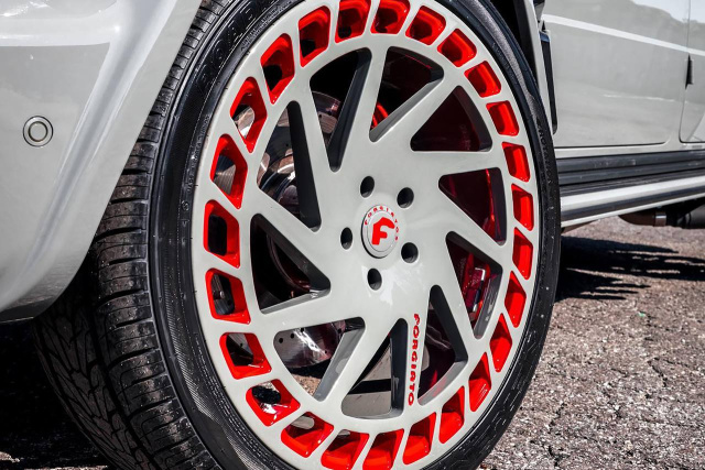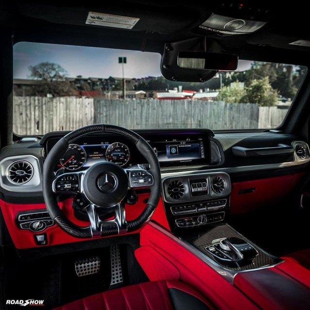So reich dieser G63 infolge seiner Panzerung an Ballaststoff ist, so fett macht er beim Betrachter Eindruck. Was dem Auge gefällt, sind die rundherum doll angelegten Carbon-Styling-Parts, die beiden seitlich ausmündenden Endrohr-Trios, das schöne rote Interieur sowie last but not least die 24-Zoll-großen Forgiato-Räder im Bicolor-Finish