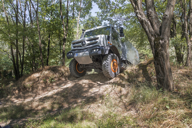 Große Zuverlässigkeit und Robustheit, die hohe Nutzlast und der Einsatz in Temperaturbereichen von -30 bis +45 °C machen den Unimog zu einem verlässlichen Begleiter in schwierigem Gelände. Beim Überfahren von Baumstämmen zeigen sich die Vorteile der extremen Verwindungsfähigkeit und der hohen Bodenfreiheit von rund 50 cm durch Portalachsen mit Schubrohrtechnik. Die Watfähigkeit bis maximal 1,20 m Tiefe erlaubt das Durchqueren von Flüssen. Und in sumpfigem Moorgelände oder auf sandigen Böden lässt sich der Reifendruck automatisch via Tirecontrol plus einfach über das Display in der Instrumententafel anpassen, mit vorprogrammierten Fahrmodi wie „Straße“, Sand“ oder „Schlechtweg“.