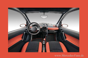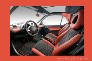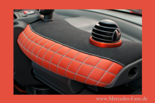 Im Innenraum des smart von Vilner ging Leder wirklich über alles. Die Lederlandschaft (teilweise mit Rautensteppung) mit schwarzem und orangefarbenen Fellen verwöhnt das Gesäß, fühlt sich edel an und schmeichelt dem Auge. Zum Bicolor-Leder-Interieur gesellen sich noch spezielle Fußmatten, ein paar Chromteile und ein ebenfalls in Leder eingefasstes Volant. Übrigens gibt es von dem Umbau ein kleines Video. Der Film zeigt, wie es bei dem Tuner Vilner zugeht, und dass die Mannschaft anscheinend mit Spaß bei der Arbeit ist.